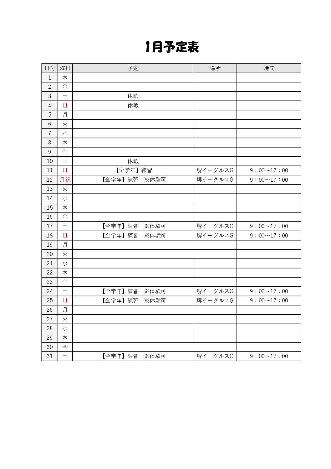 1月のスケジュールです。体験のご参加お待ちしております。